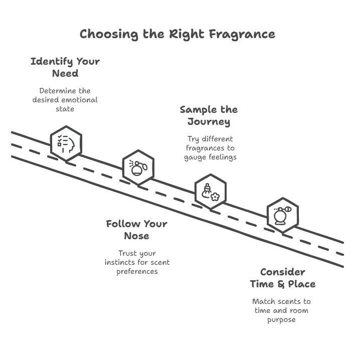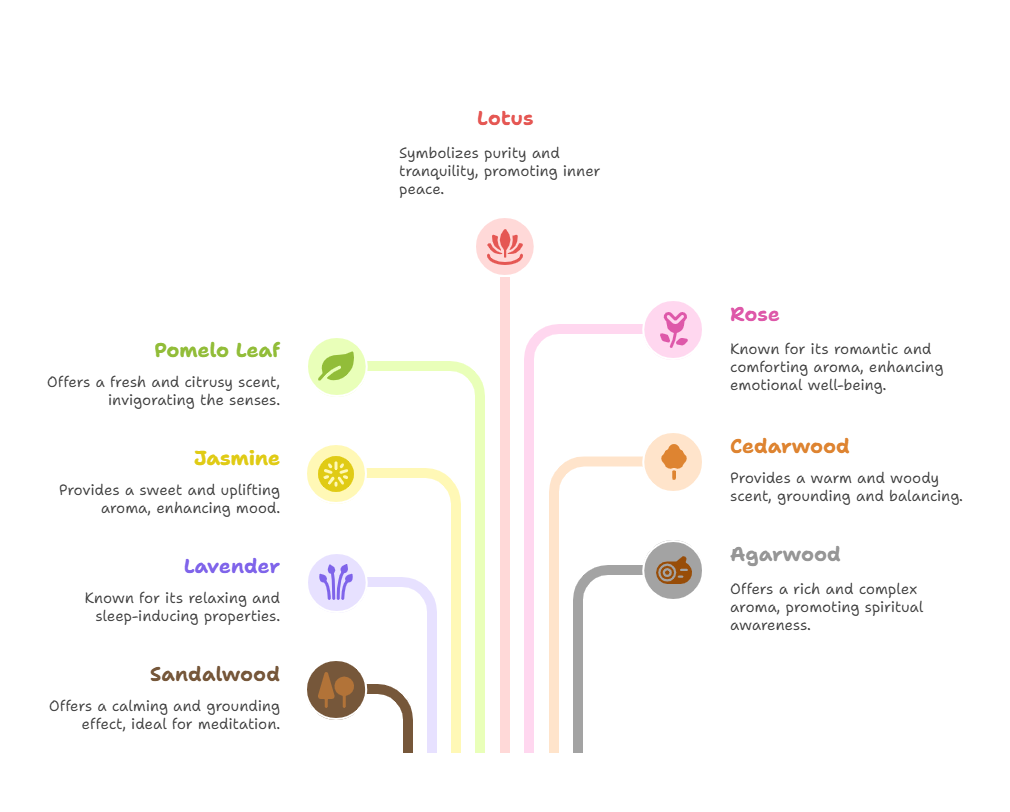 Identify Your Need Are you seeking calm (Lavender, Sandalwood), joy (Jasmine, Pomelo Leaf), focus (Cedarwood, Sandalwood), romance (Rose, Jasmine), or spiritual depth (Lotus, Agarwood)?